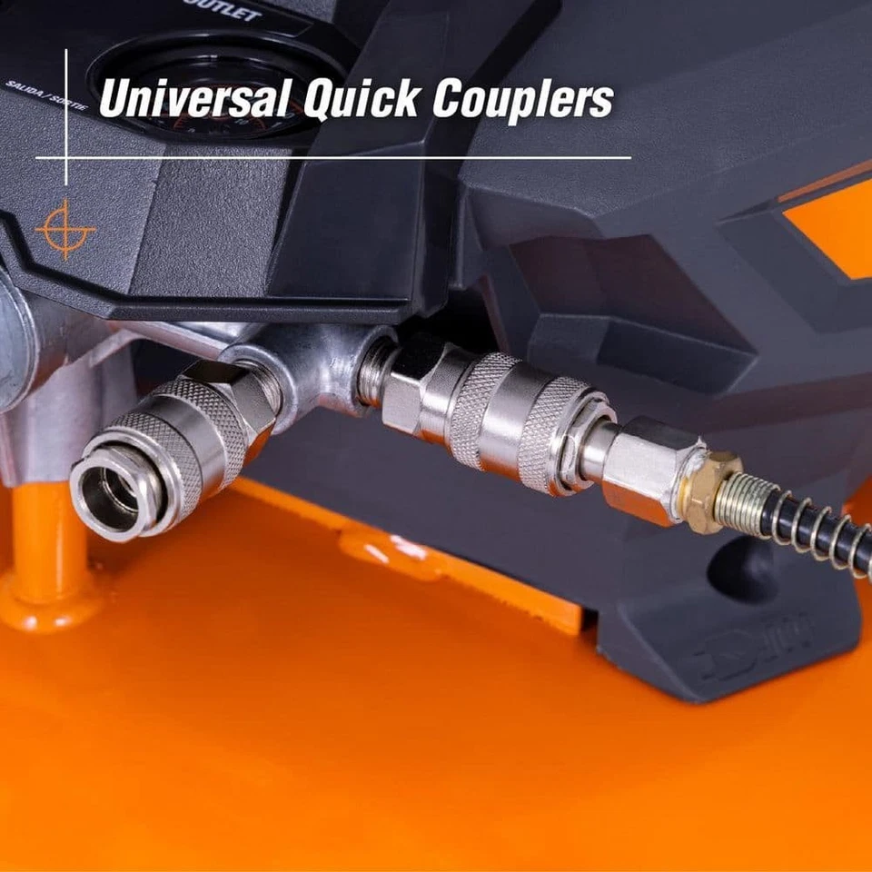 An all-in-one solution that powers your trim and finish work right out of the box: the RIDGID 6 Gal. Electric Pancake Air Compressor, designed for pros and DIYers alike. This compressor features a robust 150 PSI capacity and dual universal quick connectors, making collaboration on job sites seamless by supporting two nailers at once. With a best-in-class oil-free pump and a universal motor, it delivers dependable, maintenance-free performance, ensuring reliable operation even in low voltage conditions, while the 2.6 SCFM at 90 PSI provides high air delivery for tough tasks. The stable 6-gallon tank minimizes cycle frequency, and extras like a locking regulator, 1/4-turn ball valve drain, and compatible quick couplers add convenience and control. Backed by a Limited Lifetime Manufacturer’s Warranty, this RIDGID compressor offers lasting durability, so you can tackle every project with confidence and ease.